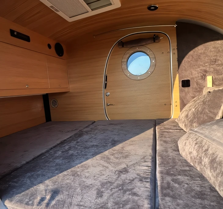 The oak-veneered interior is cozy and comfortable, and the fully equipped kitchen (including a water heater and shower connection) allows for comfortable camping.